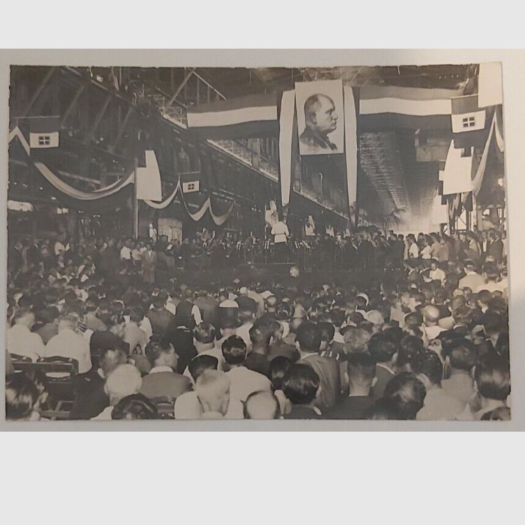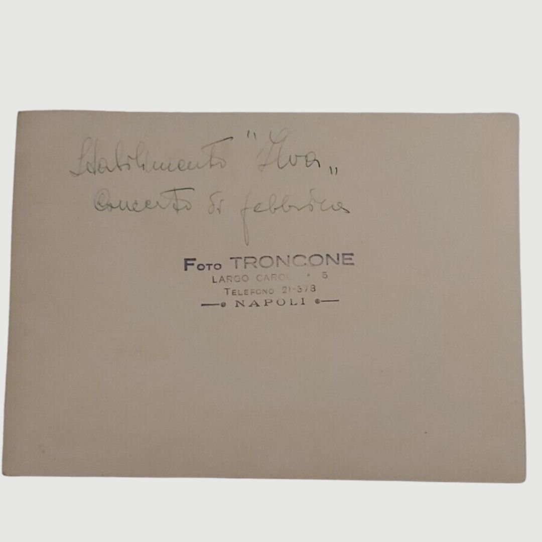 cm 18×13. Fotografia orginale. Tracce d’uso ai margini. Fascismo a Napoli. Concerto allo stabilimento Ilva di Bagnoli. Al verso didascalia a lapis "Stabilimento Ilva. Concerto di fabbrica". Timbro Foto Troncone-Napoli. Non comune.