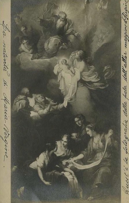Stampa fotografica alla gelatina ai sali di argento di misure 89x140 mm. Condizioni : USATO - Stato : Buono. Altre note : Fotografia che ritrae la pala dell'altare maggiore della chiesa di Pergine: è rappresentata la natività della Vergine. Al verso note manoscritte.