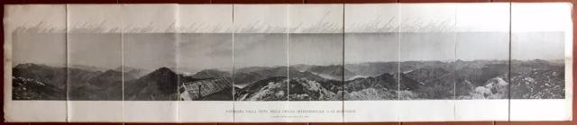 Pubblicata in occasione del 25° Anniversario della Sezione di Milano 1873 – 1898, rara e grande fotografia (fotoincisione) a leporello applicata su tela. La foto misura cm 38 x 186 ed è suddivisa in 10 comparti di cm 18 x 38 ciascuno. Lo scatto riprende, in tutto il suo longitudinale sviluppo, la catena della Grigna Settentrionale (detta anche di Moncodine, provincia di Lecco) e segnala ogni vetta, dal Pizzo Porese m 2720 al Monte Chiavello m 1786. Astuccio in carta con titoli in azzurro al piatto anteriore: "Club Alpino Italiano. 25° Anniversario della Sezione di Milano 1873 - 1898". Per fotografia a leporello si intende un'unica striscia di carta ripiegata come una fisarmonica le cui origini risalgono al IX secolo e che alcuni conoscono come “libro di concertina”. Alcuni aloni in copertina e marginalmente al retro della tela, usuali imperfezioni marginali, molto buono lo stato di conservazione dell'intera fotografia.