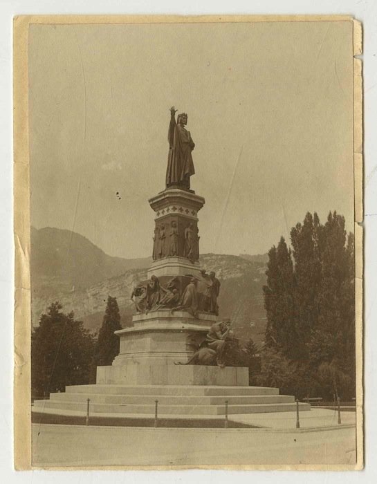 Stampa all'albumina di misura 108x78 mm. Condizioni : USATO - Stato : Buono, bordi leggermente frastagliati. Altre note : Fotografia scattata in piazza Dante a Trento. L'immagine rappresenta la statua a Dante.