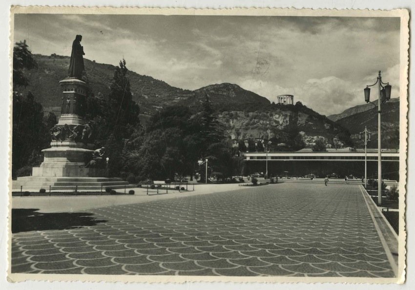 Cartolina postale fotografica di misure 147x102 mm con griglia al verso. Condizioni : USATO - Stato : Buono, ordinari segni d'uso e del tempo. Altre note : La fotografia raffigura Piazza Dante: in primo piano il monumento a Dante, in secondo piano la stazione ferroviaria e sullo sfondo il Doss Trento dove sorge il mausoleo a Battisti. Cartolina viaggiata a Diano Marina con francobollo e timbro dell'ufficio postale di Trento. Al verso note manoscritte e altro timbro postale.