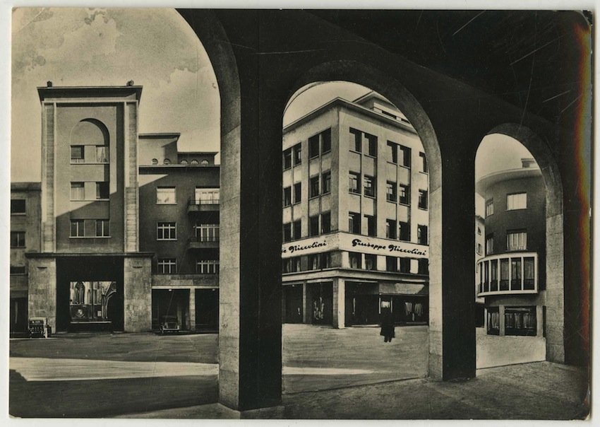 Cartolina postale fotografica alla gelatina di misure148x105 mm con griglia al verso. Condizioni : USATO - Stato : Buono, ordinari segni d'uso e del tempo. Altre note : Fotografia raffigurante Piazza Italia: in primo piano i portici, in secondo piano il negozio Niccolini. Cartolina viaggiata a Diano Marina con francobollo e timbro dell'ufficio postale di Trento. Al verso note manoscritte.