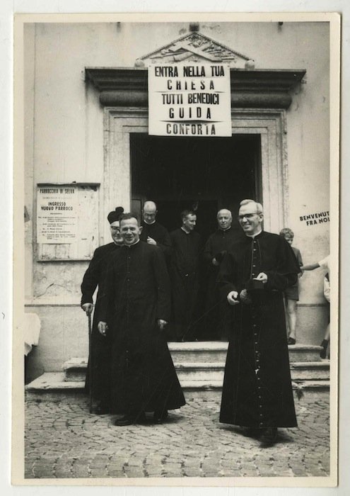 Stampa alla gelatina ai sali d'argento di misura 102x147 mm. Condizioni : USATO - Stato : Buono, ordinari segni d'uso e del tempo. Altre note : Veduta della presentazione del nuovo parroco, Don Luigi Degasperi, presso la comunità di Selva: in primo piano il nuovo parroco assieme ad altri sacerdoti all'uscita della chiesa. Al verso timbro del fotografo.