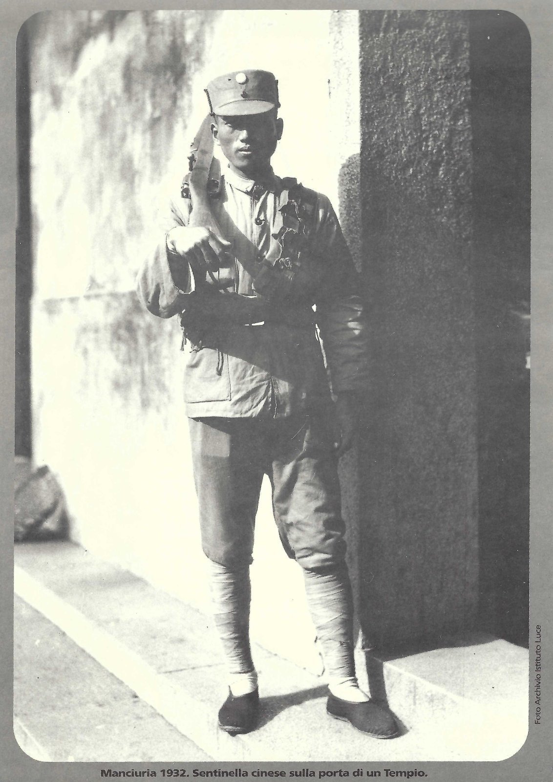 Riproduzione foto archivio Istituto luce Manciuria 1932 sentinella cinese sulla porta di un tempio