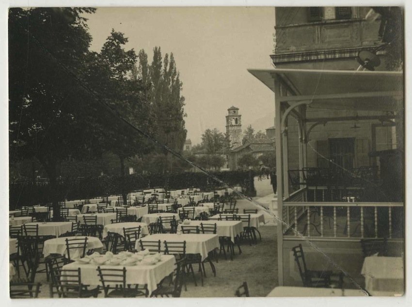 Stampa fotografica alla gelatina ai sali d'argento di misure 113x83 mm. Condizioni : USATO - Stato : Buono, ordinari segni d'uso e del tempo. Altre note : Fotografia raffigurante un giardino con i tavoli e le sedie di un ristorante, a lato l'edificio e sullo sfondo la Torre di San Lorenzo. Al verso note manoscritte.