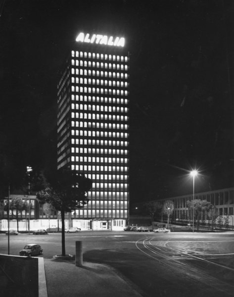 Roma, Il grattacielo dell'Alitalia al Laghetto dell'Eur. Vista notturna