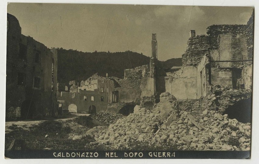 Cartolina postale fotografica alla gelatina ai sali d'argento di misura 136x87 mm con griglia al verso. Condizioni : USATO - Stato : Buono, ordinari segni d'uso e del tempo. Altre note : Fotografia con veduta di Caldonazzo distrutta dai bombardamenti della prima guerra mondiale. Sono raffigurate le rovine degli edifici.