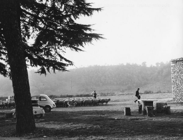 La foto di dimensioni 18x25 ritrae delle pecore al pascolo nello spazio antistante la Cattedrale di Rieti