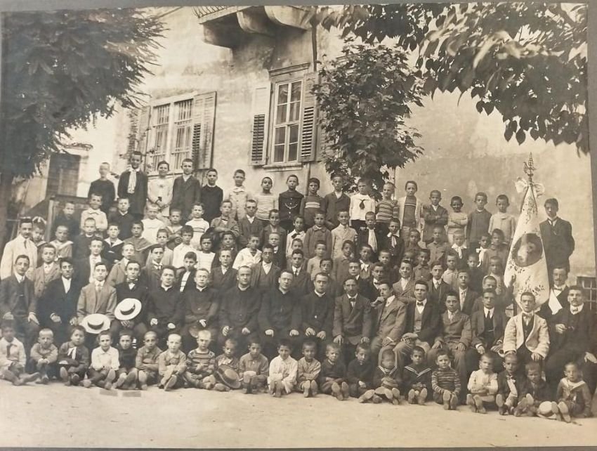 Stampa originale d'epoca alla gelatina ai sali d'argento in bianco e nero di cm 38x28. Condizioni : USATO - Stato : Buono, ordinari segni d'uso e del tempo. Altre note : Nel gonfalone è raffigurato probabilmente Giuseppe Grazioli.