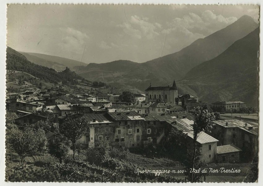 Cartolina postale fotografica alla gelatina di misure 147x105 mm con griglia al verso. Condizioni : USATO - Stato : Buono, ordinari segni d'uso e del tempo. Altre note : Veduta di Spormaggiore: spicca la Chiesa di San Vigilio. Cartolina viaggiata a Diano Marina con francobollo e timbro dell'ufficio postale di Spormaggiore. Al verso note manoscritte.