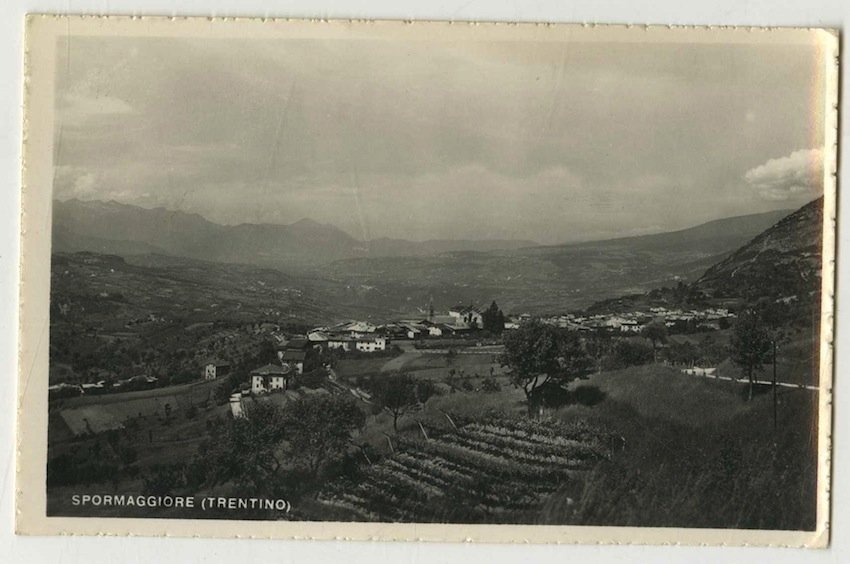 Cartolina postale fotografica alla gelatina di misure 139x90 mm con griglia al verso. Condizioni : USATO - Stato : Buono, ordinari segni d'uso e del tempo. Altre note : Veduta di Spormaggiore. Cartolina viaggiata a Trento con francobollo e timbro dell'ufficio postale di Spormaggiore. Al verso note manoscritte.