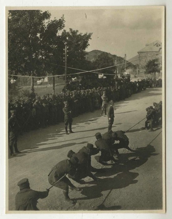 Stampa alla gelatina ai sali d'argento di misura 75x98 mm. Condizioni : USATO - Stato : Buono. Altre note : Veduta di alcuni soldati che giocano al tiro alla fune.