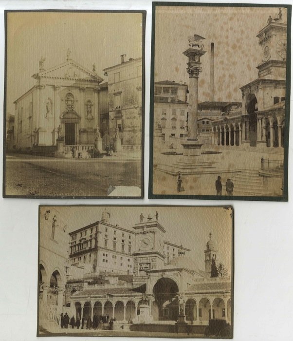 3 stampe fotografiche all'albumina di misure 173x117 mm montate su cartoncino di misure 176x120 mm. Condizioni : USATO - Stato : Segni d'uso e del tempo, segni di precedente incollatura al verso. Altre note : Lotto di 3 fotografie che raffigurano Udine: la loggia di San Giovanni con la torre dell'Orologio, Piazza Libertà con la colonna con il leone marciano della Serenissima, la Chiesa di Sant'Antonio Abate. IL PREZZO SI RIFERISCE AL LOTTO DELLE 3 FOTOGRAFIE.