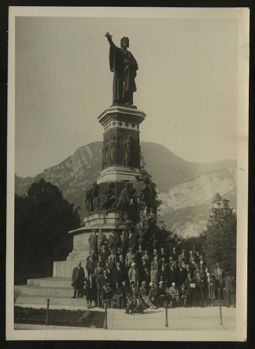 Un gruppo di Dopolavoristi Torinesi in gita nel Trentino presso il Monumento di Dante Alighieri. Trento.