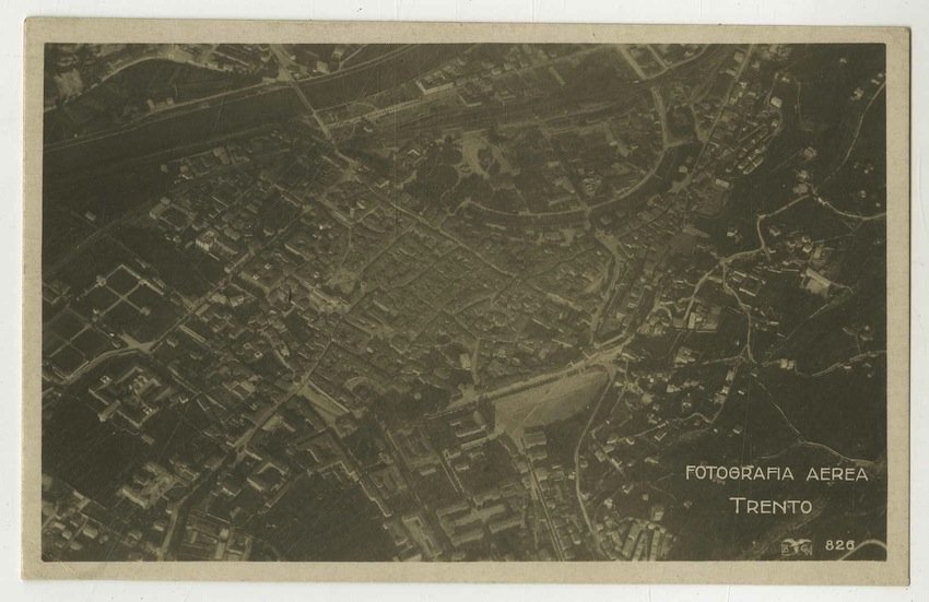 Cartolina postale fotografica alla gelatina ai sali d'argento di misura 133x84 mm con griglia al verso. Condizioni : USATO - Stato : Buono, ordinari segni d'uso e del tempo. Altre note : Veduta aerea di Trento. Si riconoscono il fiume Adige, Piazza Venezia ancora spianata, il castello del Buonconsiglio, piazza Duomo con la cattedrale. La data si evince da una fotografia della stessa serie. Al recto è stampato da lastra il numero: "826" e il timbro del fotografo.
