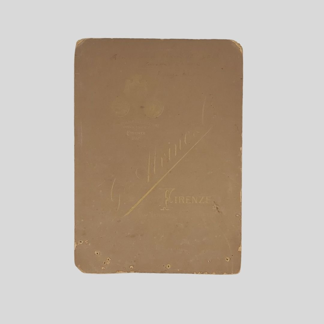 Fotografia all’albumina formato “Salon”, mm 217×172 (fotografia), mm 245×176(supporto). Al recto è presente il marchio a rilievo del fotografo: «G. Alvino – Firenze», nonché a didascalia a inchiostro: “opera Lombardi”. Al verso dedica autografa, leggermente stinta, a inchiostro seppia, non firmata: ««Alla mia cara moglie Concetta Larizza»». Tracce d’uso alla fotografia, alcuni buchetti marginali, mancanza agli angoli con perdita del caratteri del cognome del fotografo al margine dx della fotografia e agli angoli del supporto. Raro ritratto fotografico del tenore napoletano Vincenzo Larizza in abiti di scena da: “I Lombardi alla prima crociata”. Fu molto apprezzato in Italia e all’estero, scomparve prematuramente nel 1902.