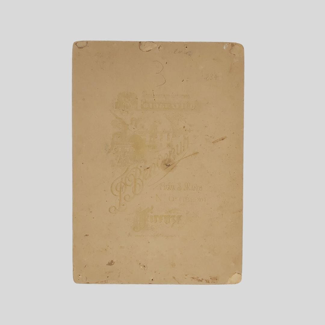Fotografia all’albumina formato “Salon”, mm 215×168 (fotografia), mm 246×174(supporto). Al recto didascalia a inchiostro: «Larizza. Ernani» e marchio del fotografo “, ripetuto al verso: «F. Benvenuti-Firenze». Tracce d’uso alla fotografia e al supporto, alcuni buchetti, abrasioni, esemplare lievem. ondulato. Raro ritratto fotografico del tenore napoletano Vincenzo Larizza in abiti di scena da: “Ernani”. Fu molto apprezzato in Italia e all’estero, scomparve prematuramente nel 1902