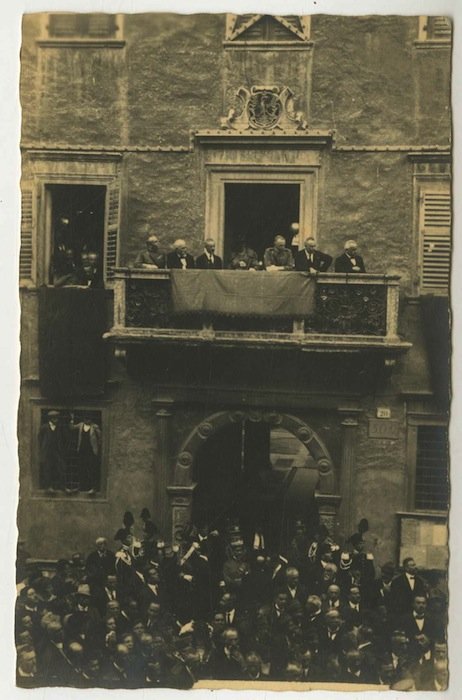 Cartolina postale fotografica alla gelatina ai sali d'argento di misura 88x138 mm con griglia al verso. Condizioni : USATO - Stato : Buono, ordinari segni d'uso e del tempo. Altre note : Fotografia scattata in occasione della vivista dei Sovrani a Trento. Il re e i suoi fedeli stanno su di un balcone, sotto le forze dell'ordine e i cittadini.