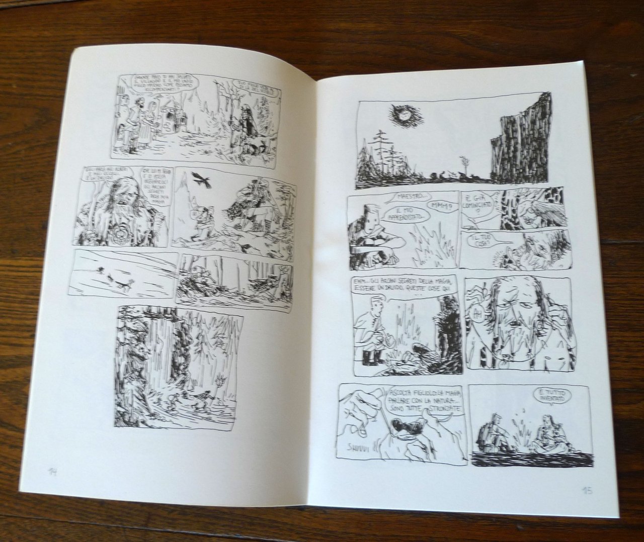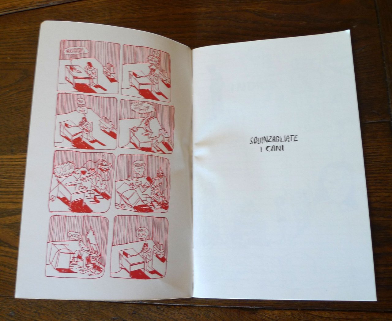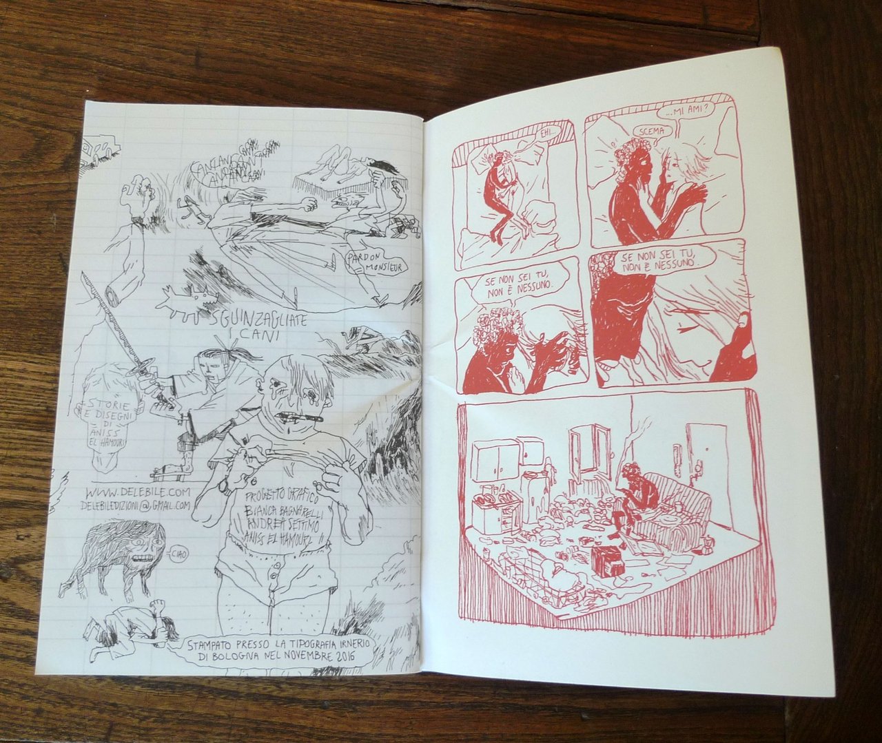 Aniss El Hamouri,SGUINZAGLIATE I CANI.Delebile, Bologna 2016,brossura, rilegatura con punto metallico,24x15 cm., pp.44,completamente illustrato a fumettiin bianco e nero,peso: g.300cod.9676CONDIZIONI DELL'ALBO: come nuovodalle note editoriali:I racconti contenuti in Sguinzagliate i cani sono dolci e dolorosi, violenti e lirici, attaccati l'uno all'altro grazie a uno stile di disegno scattante e nervoso che si muove sulla tavola naturalmente, senza nessun artificio.Realizzati di corsa, spesso su collage di fogli, su pagine di quaderni e sul retro di altre tavole, le storie che compongono questa raccolta sono veloci ma profondamente immerse in un'atmosfera malinconica e surreale.Sguinzagliate i cani è una raccolta di storie brevi a fumetti scritte e disegnate da Aniss El Hamouri (Belgio, 1989) realizzate in un periodo di due anni e pubblicate periodicamente online.L'antologia include due storie inedite.(ENG)The short, dolorous stories contained in Sguinzagliate i Cani are violent and lyric tales tied to each other by a quick and incisive stile, flowing naturally through the page, without any artifice.Drawn on the spot, often on different sheets of paper, notebooks, and the backside of other pages, the stories contained it this volume are swift, but deeply immersed in a melancholic and surreal atmosphere.Sguinzagliate i cani is a collection of stories written and drawn by Aniss el Hamouri (Belgium, 1989) over the period of two years, and regularly published online.The volume contains two unpublished stories.