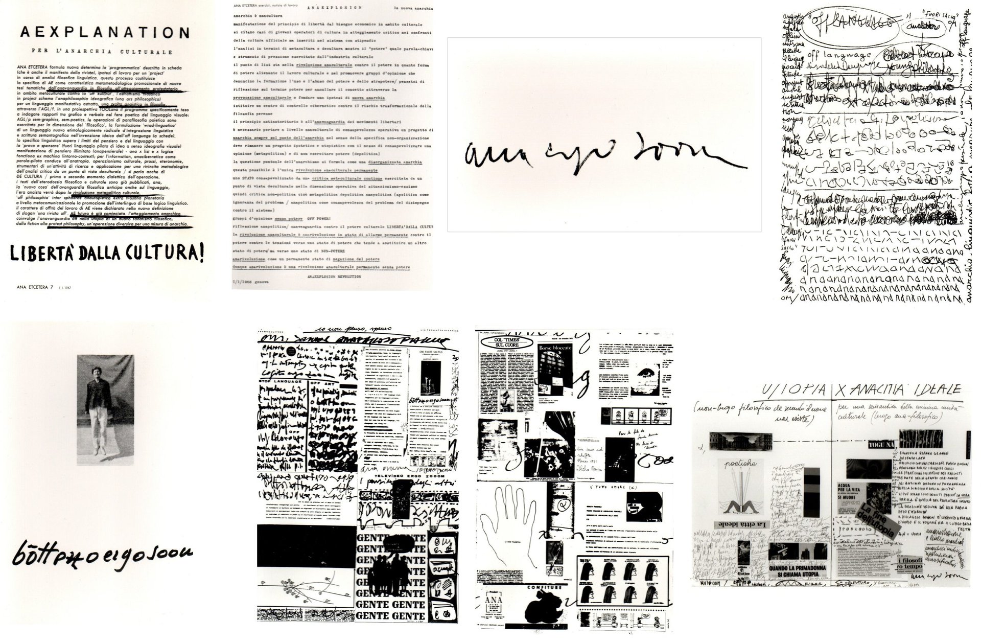 1) Aexplanation. Per l'anarchia culturale; 2) Anaexplosion. La nuova anarchia; 3) Ana ergo sum; 4) Bottezzo ergo soom; 5) Io non penso spenso; 6) Journal Anaphilosophicus; 7) Off language; 8) U/topia x anacittà ideale