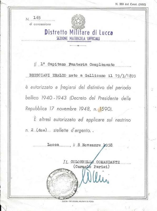1° Capitano di Fanteria nato a Gallicano è autorizzato a fregiarsi del distintivo del periodo bellico 1940-1943.