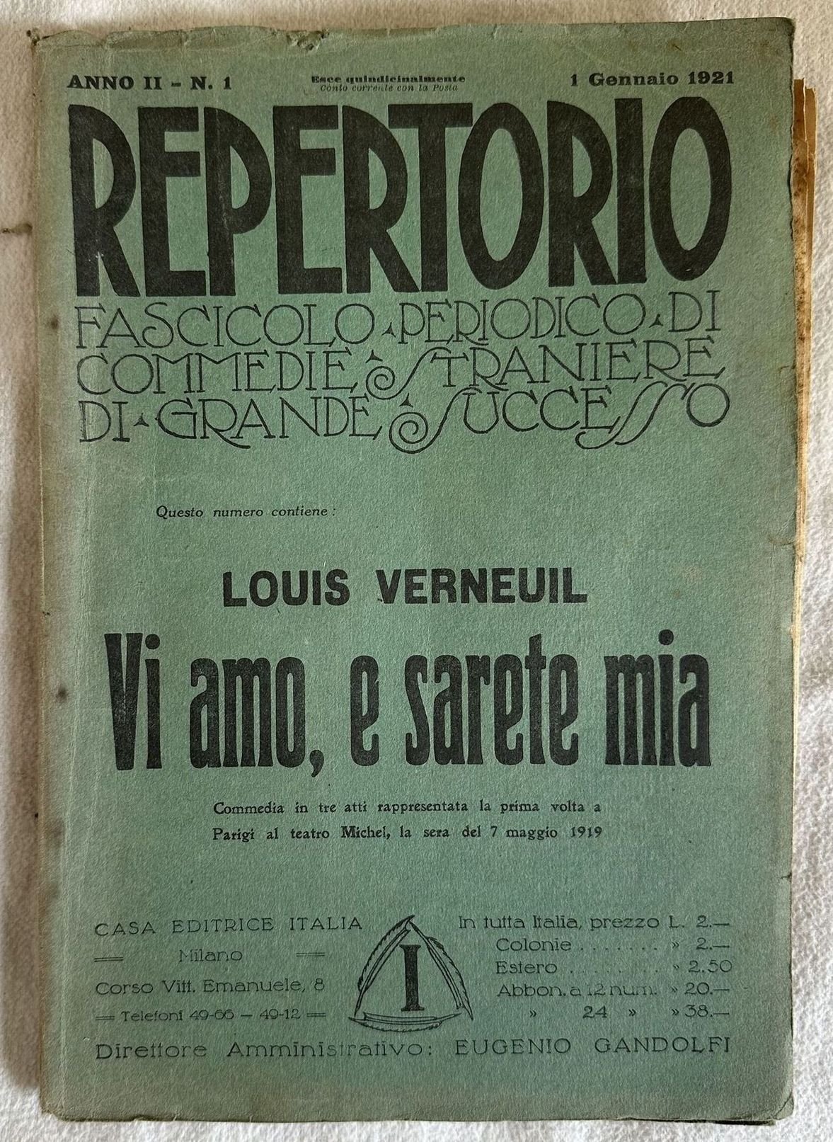 Edizione del 1 gennaio 1921 delle commedia teatrale "Vi ami, e sarete mia" di Louis Verneuil della collana "Repertorio fascicolo periodico di commedie straniere di grande successo". In buone condizioni. Copertina editoriale in buone condizioni generali con lieevi usure ai margini e dorso. Legatura in buone condizioni. All'interno le pagine si presentano in buone condizioni con rare fioriture. In 8. Dim. 25x17,5 cm. Pp. 44+(4).Edition of 1921 of the theatre play "Vi ami, e sarete mia" by Louis Verneuil of the series "Repertorio fascicolo periodico di commedie straniere di grande successo". In good conditions. Editorial cover in good general conditions lgihtly worn in the extremities. Binding in good conditions. Inside pages are in good conditions with occasional foxing. In 8. Dim. 25x17,5 cm. Pp. 44+(4).<BR><BR>