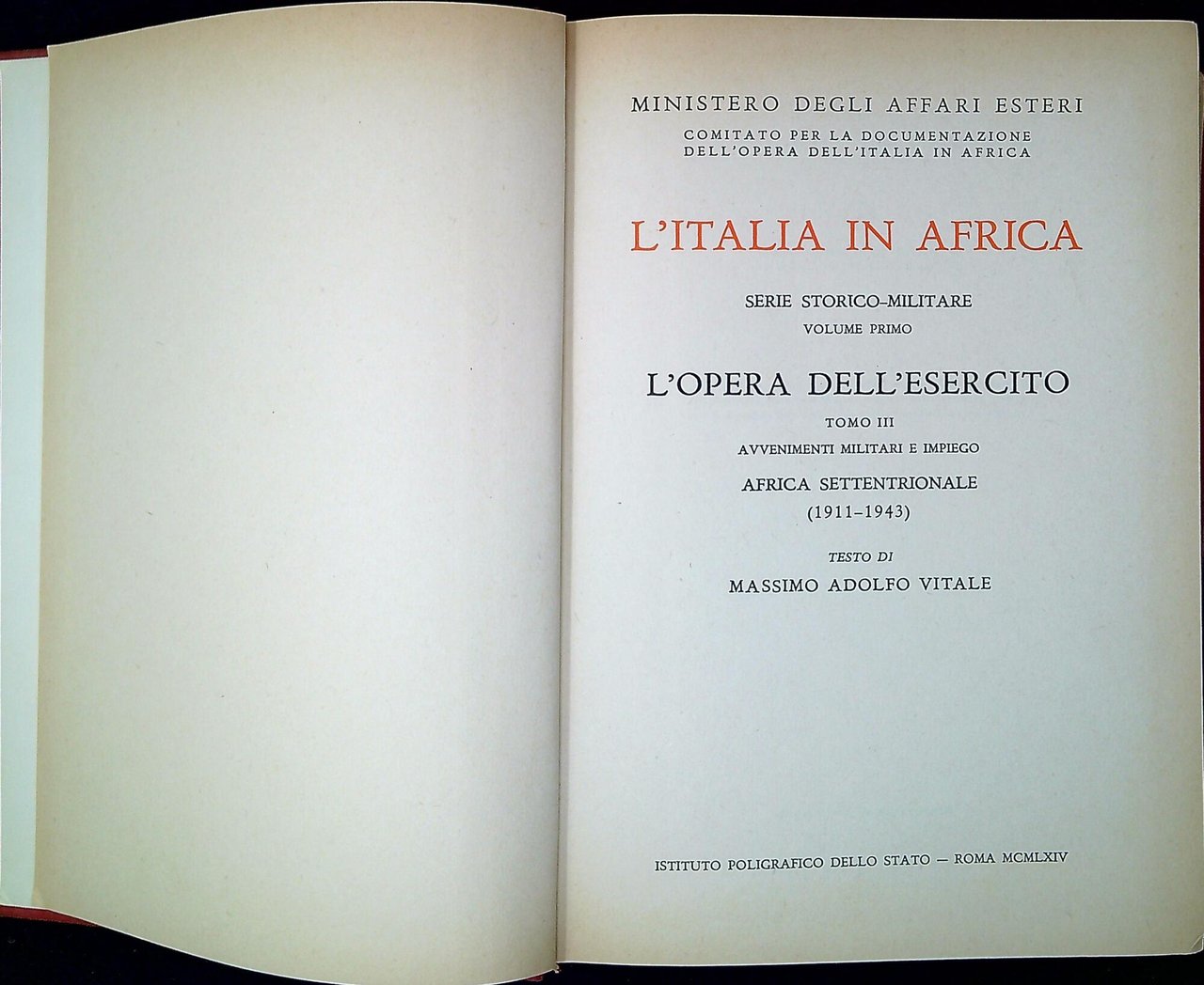 Vitale, Massimo Adolfo 1: L'opera dell'esercito. 3, Avvenimenti militari e impiego: Africa settentrionale, 1911-1943. Roma, Istituto poligrafico dello Stato 1964, XXIII, 414 p., [58] c. di tav. : ill. ; 25 cm, Tracce d'uso al dorso (70677)