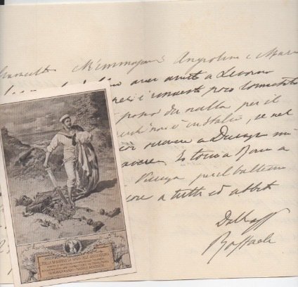 AUTOGRAFOLettera scritta ad un amico di argomento personale nella quale aggiunge: «M’immagino Angiolina e Maria il lavoro che debbano aver avuto a Livorno per la squadra […]. Non ti posso dir nulla per il Duca degli Abruzzi perché non è in Italia […]».