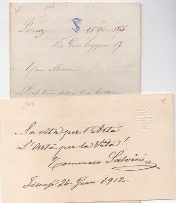 AUTOGRAFOLettera di argomento lavorativo «[.] Io ti dissi, che essendo tu impegnato con Rossi fino a tutto Maggio e Giugno, non avrei potuto approfittare della tua esibizione e non l’avrei accettata anche se tu l’avessi voluto. Da che sono nell’arte, e sono parecchi anni non ho mai fatto simili gherminelle, che molti, o forse tutti hanno fatto a me [.]». Sul biglietto invece è scritto: «La vita per l’Arte / L’Arte per la Vita!».