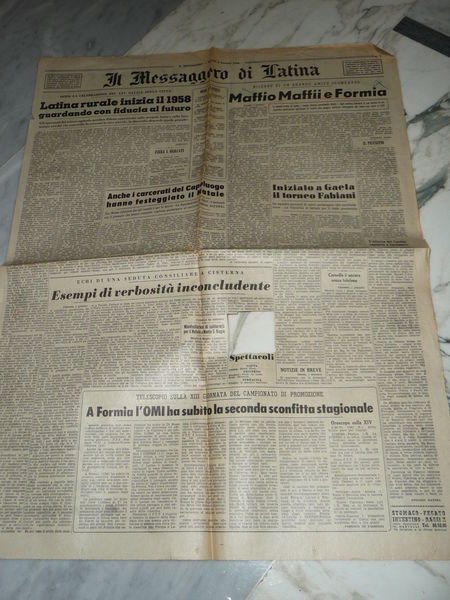 TITOLO: PALUDE PONTINA Anno II n. 6 dell' 8 febbraio 1958 e la prima pagine del MESSAGGERO DI LATINA del 2 gennaio 1958 AUTORE: AA.VV. DESCRIZIONE: 2 Giornali di fine anni '50 con notizie locali dell'Agro Pontino, fra cui la morte di MAFFIO MAFFII, inaugurazione della Terracina-Sperlonga- Formia etc. CONDIZIONI DELL'OGGETTO: Buone, il giornale PALUDE PONTINA è integro in ogni sua parte, mentre il MESSAGGERO è solo la prima pagina con evidente ritaglio al centro. PESO/WEIGHT: 50 g without package