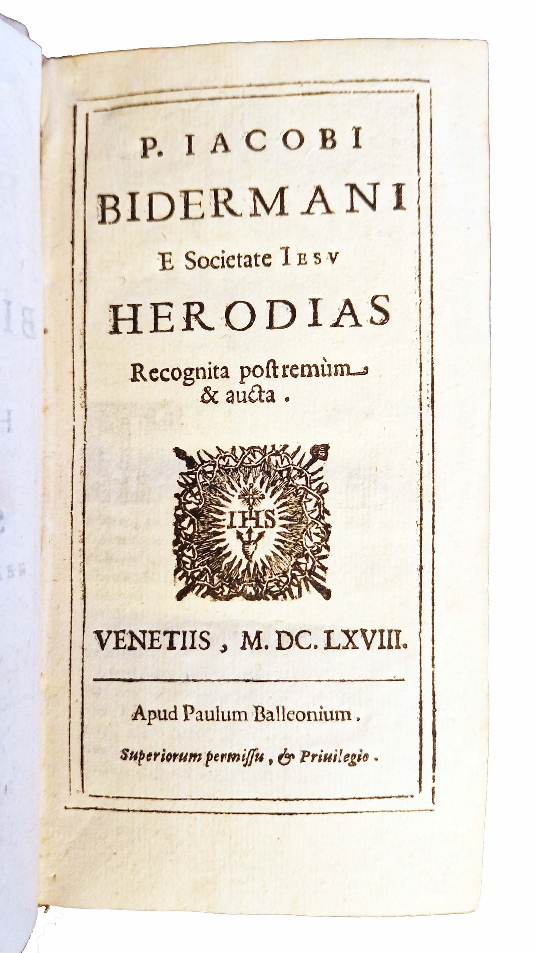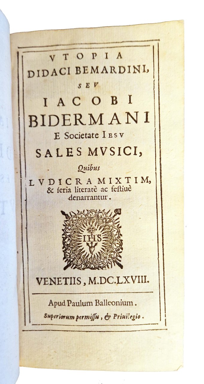 [1.]: P. Iacobi Bidermani e Societate Iesu Herodias recognita postremùm & aucta. [legato con]: [2.]: Vtopia Didaci Bemardini, seu Iacobi Bidermani e Societate Iesu Sales musici, quibus ludicra mixtim, & feria literate ac festiue denarrantur.