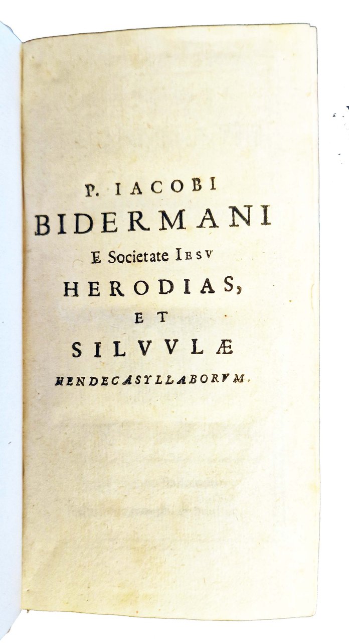 in-12°, 150x80 mm, leg. in piena pergamena, con titolo manoscritto al dorso, tagli puntinati di rosso; due opere del Bidermann, legate in un volume. Entrambe le opere hanno i frontespizi (2+1) all'interno di cornice a doppio filetto, emblema dei Gesuiti e sono precedute dal'occhietto. [1.]: la prima opera è composta da 2 parti: pp. 114, [6]; 131, [1]; la seconda parte, annunciata all'occhietto, e preceduta da un suo frontespizio, è intitolata: "P. Iacobi Bidermani . Iesu Siluulæ hendecasyllaborum". [2.]: la seconda opera ha 310 [i.e. 312] pp.; le pp. 143-144 sono ripetute nella numerazione. Prima edizione veneziana, a cura del Baglioni, di queste due opere del Bidermann. Rif.: [1.]: IT\ICCU\TO0E\007915. OCLC, 955930161. [2.]: IT\ICCU\TO0E\007920. OCLC, 955930162. Cond.: Esemplare in ottime condizioni.