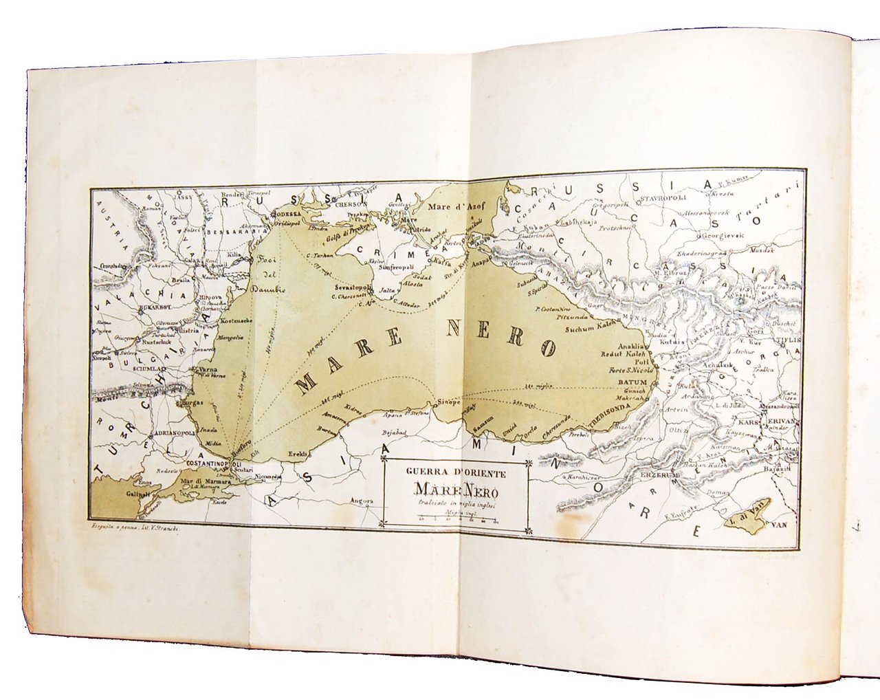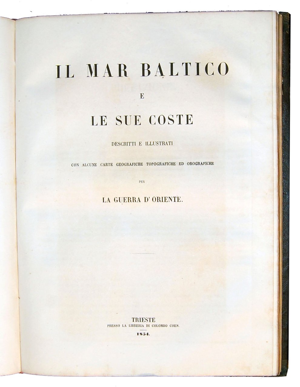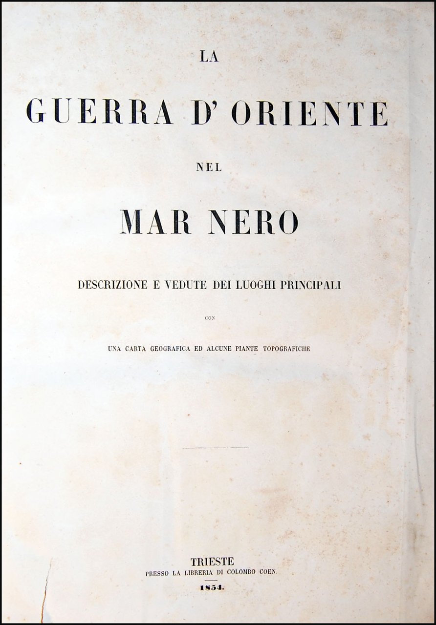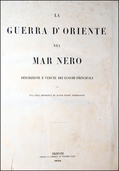 4to, 314x224 mm, contemporary half leather binding with decorated paper at boards, gilt title and decorations at spine; pp. 78, [1], [3] folded plates, [10] plates; 131, [2] folded plates, [16] plates. Names of the Authors respectively at pages 78 of the first work and 3 of the second one. RARE SET OF TWO RICHLY ILLUSTRATED HISTORICAL AND GEOGRAPHICAL WORKS ABOUT THE WARS IN THE BLACK SEA AND IN THE BALTIC SEA, BOUND TOGETHER [1.]: The work contains: 3 folded maps, by V. Stranski, illustrating the Black Sea ("Guerra d'Oriente - Mar Nero"), the Crimea ("Guerra d'Oriente - Crimea"), and a military plan of Sebastopoli and 10 lithographic views by V. Stranski: Gallipoli, Costantinopoli, Varna, Kustungi, Odessa, Anapa, Batum, Trebisonda, Sinope, Scutari. [2.]: The work contains: 2 folded maps, one of the War in the Baltic Sea ("Guerra nel Mar Baltico"), and a military plan of Cronstadt ("Pianta militare di Cronstadt") and 16 lithographic views by V. Stranski: Isole Aland, Barosund, Cronstadt, Nuovo Osservatorio di Cronstadt, Pietroburgo, Reval, Abo, Abo veduta dal ponte, Bomarsund, Helsingfors, Sukhum Kalè, Capo Kullen, Gustavsvern, Cristianstadt, Nargen, Sveaborg. Ref.: IT\ICCU\TSA\0804435 (with the two works together; 3 copies). OCLC, 635756710 (with the two works together; only 1 copy in Switzerland) and 79289355 (only 1 copy in USA, just of the first work, at the HCL Technical Services, Harvard College Library, Cambridge). Cond.: A tear at title-page without loss of paper and not interesting the text (easy to be repaired). Some usual foxing for this type of paper. A good copy.