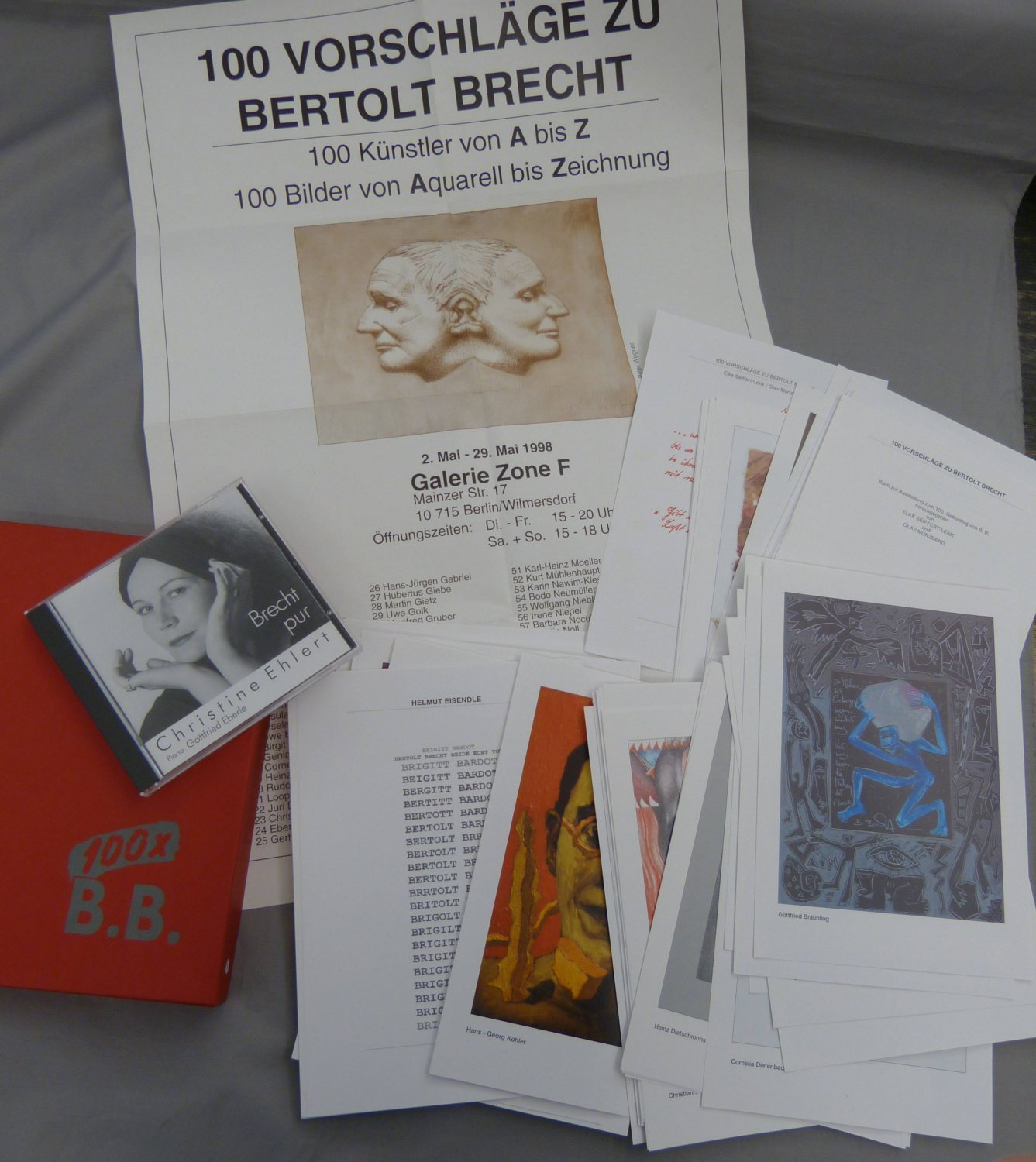 100 Vorschläge zu Bertolt Brecht. Buch zur Ausstellung zum 100. Geburtstag von B. B., herausgegeben von Elke Seiffert-Lenk und Olav Münzberg. / 100 Künstler von A-Z, 100 Bilder von Aquarell bis Zeichnung. ~115 lose Blatt in einer Pappbox. Mit einleitenden Texten und 100 ganzseitigen Farbabbildungen von 100 verschiedenen Künstlern, von Irmingard von Bayern bis Karin Zimmermann. Weiterhin eine CD "Brecht pur" von Christine Ehlert, von der Künstlerin signiert! Außerdem ein Ausstellungsplakat und eine längere persönliche Widmung von Elke Seiffert-Lenk "für den lieben Chris".
