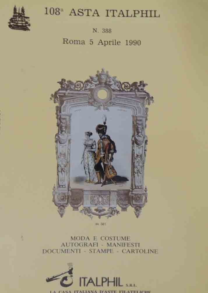 108a Asta Italphil. N. 388. Roma 5 aprile 1990 ore 15,00. Moda e costume, autografi, manifesti, documenti, stampe, cartoline, erotismo artistico, numero monografico di Catalogo Italphil. Pubblicazione trimestrale, anno XXIV, n. 3, I trimestre 1990, Italphil s.r.l., s.l. (ma stampato a Roma presso lo Stab. Tipo-litografico Ars Nova) 1990, pp. 100, ill. b.n., 4 c. di tavv. f.t. ill. coll., cm 27, br. ed. Descrizioni a cura di Ivo Mataloni. Lievissime tracce d’uso alla brossura, per il resto perfetto.