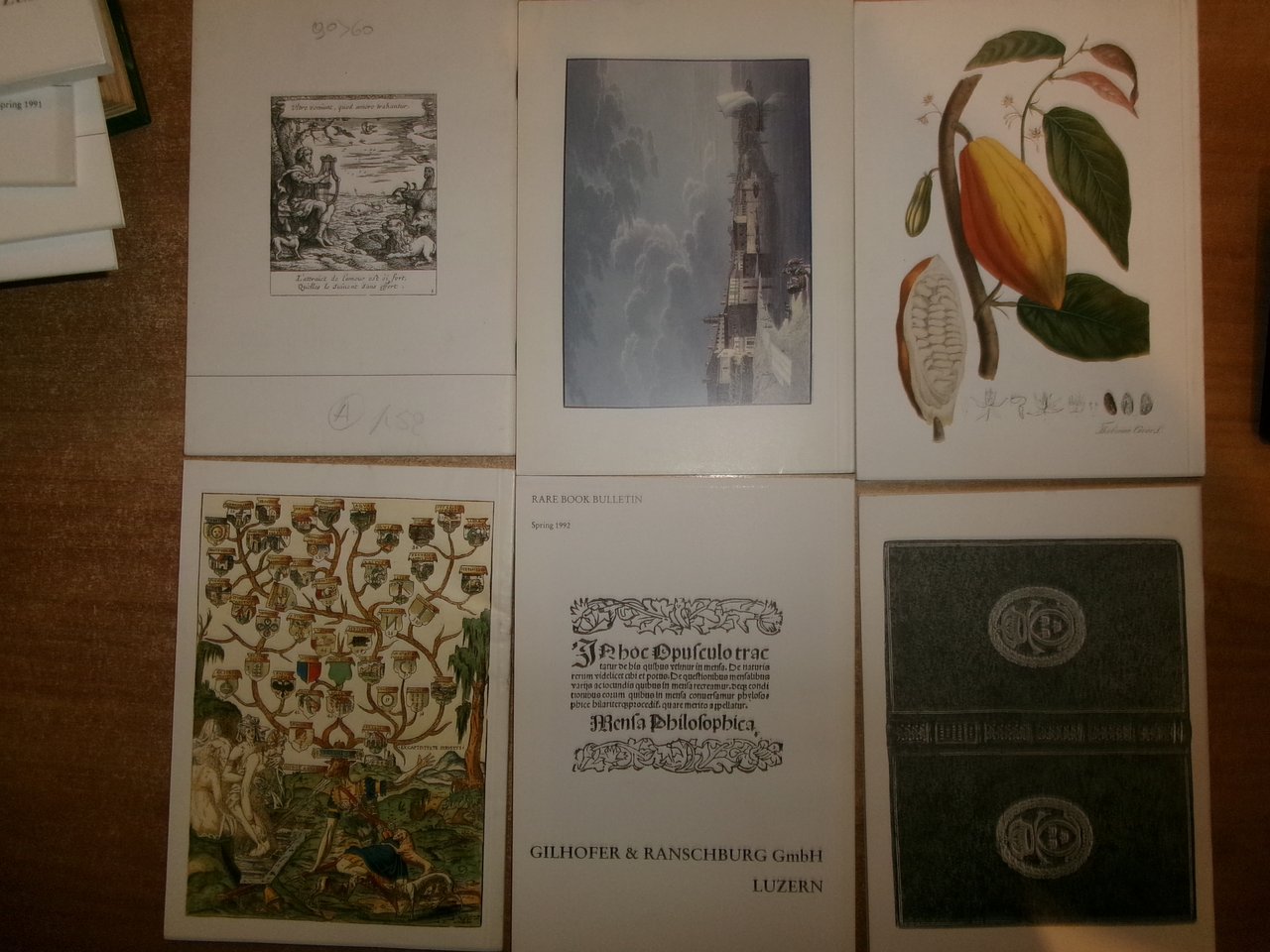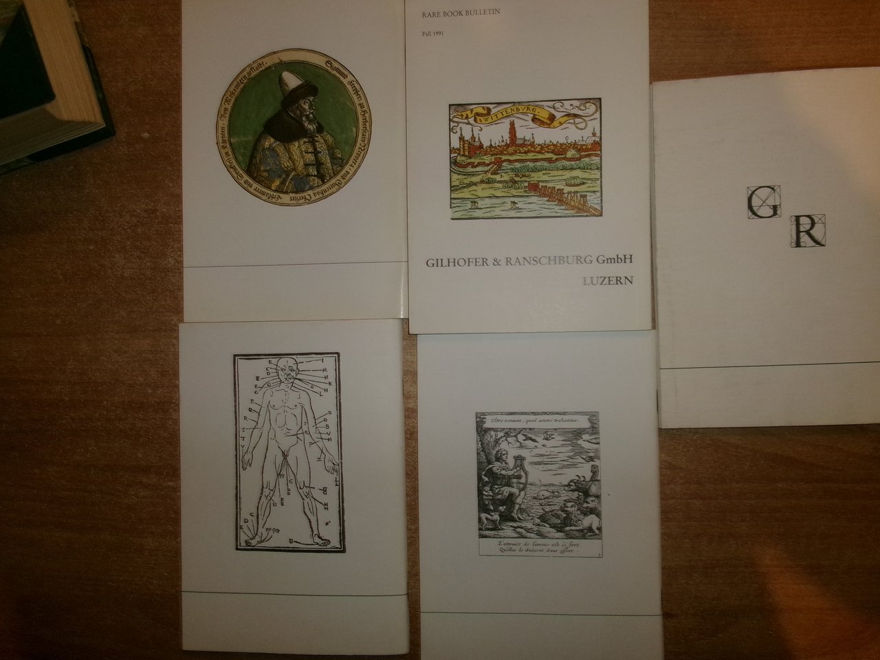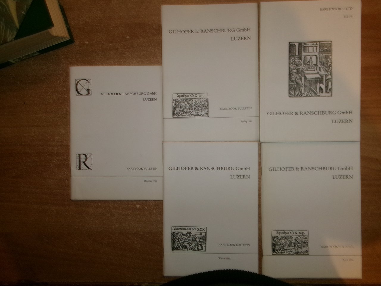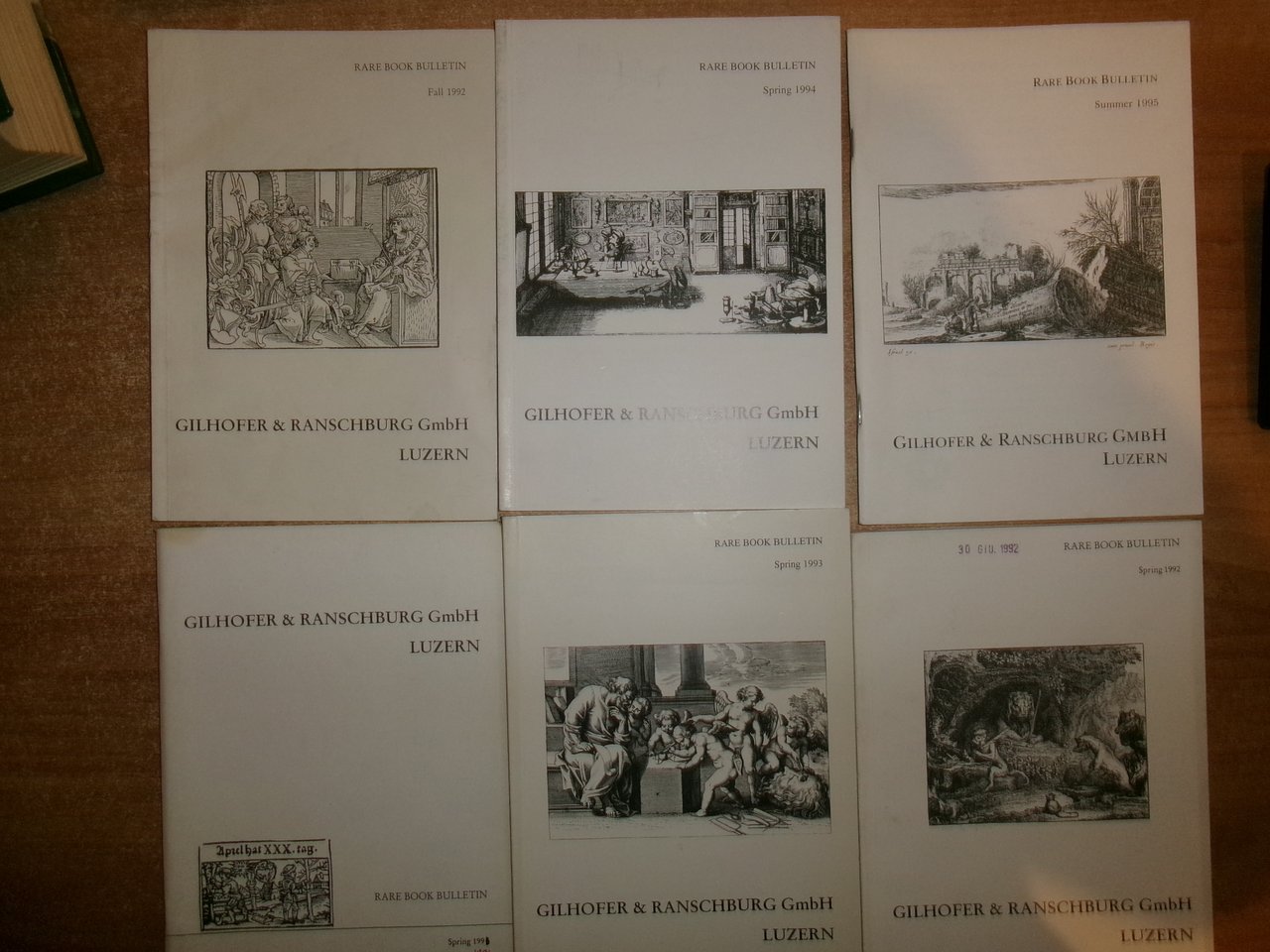 11 cataloghi Rare Book Bulletin di GILHOFER & RANSCHBURG. Luzern,1989/1995. In-8°, br. alcuni con punti metallici. Accurata descrizione di numerosi libri antichi e molto rari con prezzi in franchi svizzeri. I cataloghi sono corredati da numerose illustrazioni/facsimili nel testo. Ottimo stato. Neg. magaz. mob. grigio entro busta trasp.
