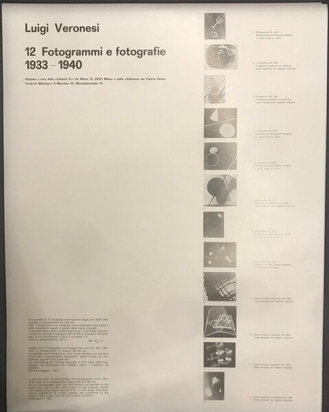 - La cartella contiene 12 fotografie e fotogrammi degli anni 1933-1940, montate in passepartout 50x65 cm. Tutti i fotogrammi e le fotografie sono stampate sulla carta e nelle dimensioni uguali a quelle delle copie originali. La stampa delle copie è stata eseguita da J. Von Pape, Monaco. L'edizione, firmata e numerata dall'artista, è limitata a 35 esemplari di cui 30 numerati 1/30 e 5 numerati I/V (questo è il nr. III/V).