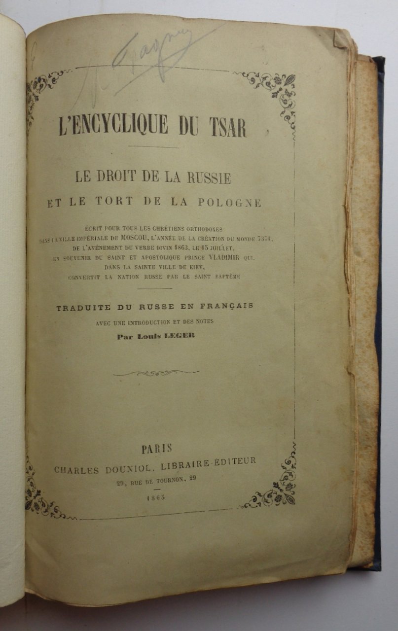 Raccolta di 14 opuscoli di diversa dimensione riuniti in un volume in tela blu, 16x26 cm, col titolo dorato al dorso Brochures politiques. Elenco manoscritto dei titoli alla pagina bianca. Tutti i pamphlets, tranne uno, conservano la loro brossura originale. Su alcuni l'INVIO manoscritto dell'Autore a Gustave Fagnez, che raccolse queste brochurtes. Elenco degli opuscoli e loro paginazione. --1) - QUINET, Edgar - LExpedizion du Mexique. Londres, Jeffs, 1862. Brossura originale blu di 39pp.- 2) - ORLEANS, Henri d - Lettre sur lhistoire de France. Paris, Dumineray, 1861. Brossura originale gialla di 31pp.- 3) - PREVOST-PARADOL - Les anciens partis. Paris, Demineray, 1860. Brossura originale beige di 48pp.- 4) - LAVERGNE, Leonce de - La Constitution de 1852 et le decret du 24 novembre 1860. Paris, Demineray, 1860. Brossura originale beige di 48pp.- 5) - FAVRE, Jules - Discours sur la seconde expedition de Rome. Paris, Le Chevalier, 1867. Brossura originale grigia di 71pp.- 6) - Lenciclique du Tsar. Le droit de la Russie et le tort de la Pologne. Paris, Douniol, 1865. Dedica a matita del traduttore a Fagniez. Brossura originale bianca di 47pp.- 7) - SAINT-BEUVE - A propos des bibliothèques populaires. Paris, Levy, 1867. Brossura originale bianca di 24pp.- 8) - PREVOST-PARADOL - Les elections de 1863. Paris, Levy, 1863. Brossura originale verde di 47pp.- 9) PELLETTAIN, Eugène - La comédie italienne. Paris, Pagnerre, 1862. Brossura originale beige di 4Opp.- 10) - GREVY, Jules - Le gouvernement necessaire. (Sixième édition) Offert par lauteur. Paris, Le Chevalier, 1873. Brossura originale grigia di 48pp. - 11) - GREVY, Jules - Discours sur la prolongation des pouvoirs a M; le Maréchal de Mac Mahon. Paris, Le Chevalier, 1873. Brossura originale bianca di 24pp.- 12) - EICHTHAL, Eugène d - Les grèves et les conseils darbitrage en Angleterre. Paris, Calye, 1872. Extrait de la Revue des Deux Mondes, brossura rosa di 22 pp. 13) - EICHTHAL, Eugène d - Les coalitions de patrons et douvriers. Paris, Claye, 1872. Extrait, brossura rosa di 30 pp. Dedica autografa a Fagniez. 14) - EICHTHAL, Eugène d - Les lois sur le travail des enfants dans les manufactures. Paris, Claye. Extrait; brossura rosa di 24 pp. Dedica autografa a Fagniez. Gustave Fagniez (1842-1927), storico di grande levatura, pubblicò studi in modo particolare sulla storia dellindustria e del commercio nei secoli XVI e XVII. Alcuni degli opuscoli qui raccolti sono rari, come quello di Quinet sulla tragica spedizione francese in Messico.