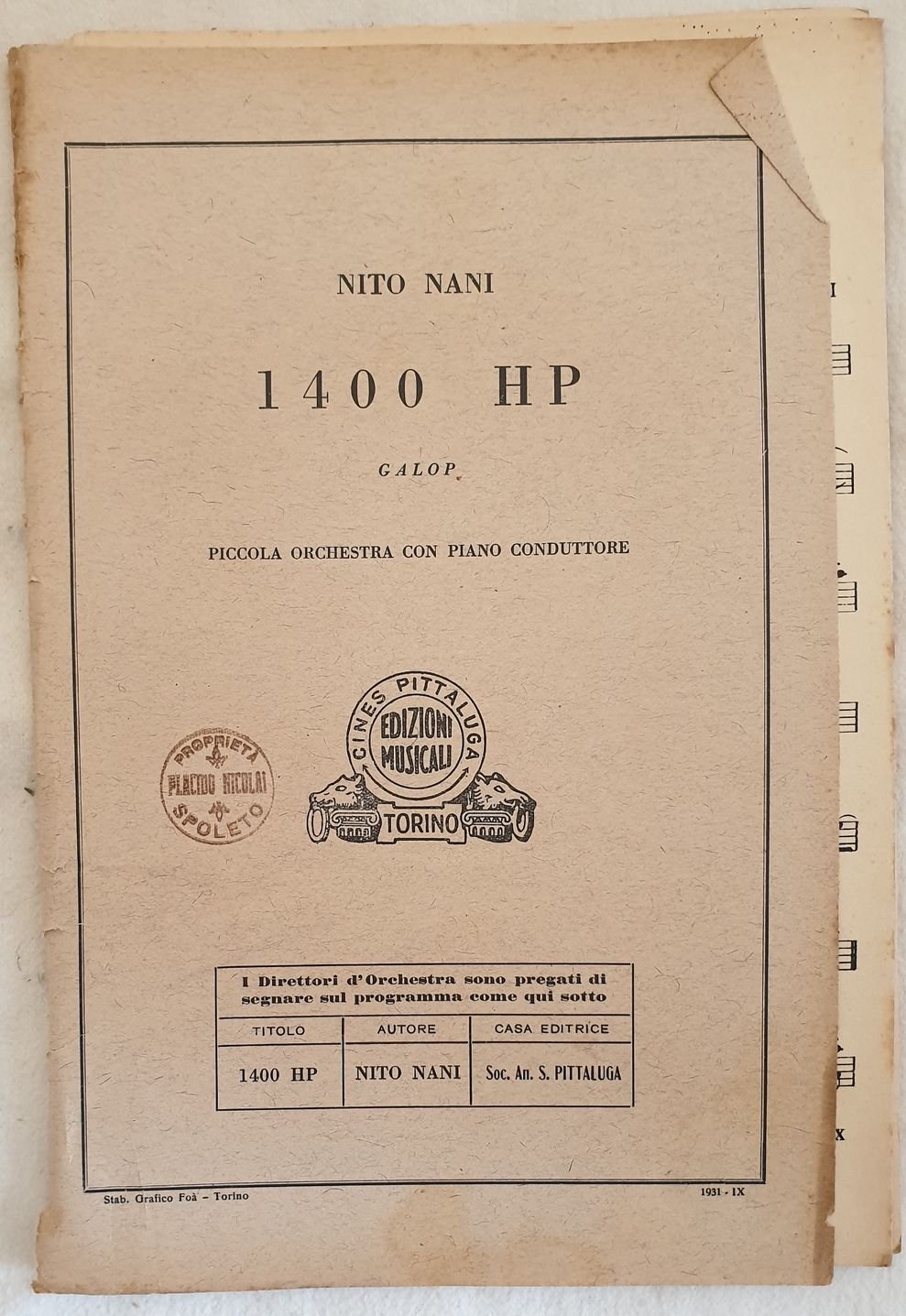 Partitura completa per orchestra del 1931 della melodia di Nito Nani "1400 HP"<BR>Copertina morbida editoriale. GENERE: STRUMENTI: pianoforte, violini; contrabasso, flauto, clarinetto, violoncello, oboe, tromba trombone, viola, fagotti, corni, batteria ANNO: 1931 DIMENSIONI: In 8. cm 27x17,5 PAGINE: pp. 22 CONDIZIONI: Mediocri condizioni. Piatto posteriore assente. Ex libris in copertina Complete score for orchestra of 1931 of the melody of Nito Nani "1400 HP" Editorial soft cover. MUSIC: STRUMENTI: piano, violin; contrabbass, flute, clarinet violoncello, oboe, trumpet , trombone, viola, fagotti, horns, drums YEAR: 1931 SIZE: In 8. cm 27x17,5 PAGES: pp. 22 CONDITIONS: Good conditions. Ex libris in the cover