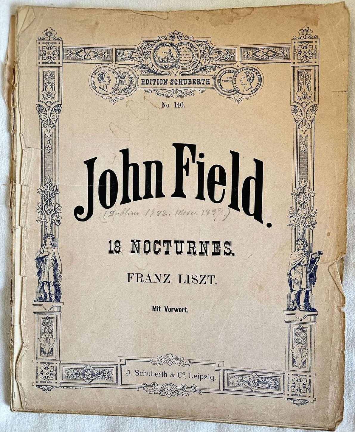 Edizione di inizio novecento di diciotto notturni del compositore irlandese John Field (1782-1837) In mediocri condizioni. Copertina editoriale in mediocri condizioni con usure marginali e strappi. Piatti staccati. Legatura editorialmente assente. Pagine in buone condizioni con rare fioriture. In Folio. cm. 34x27,5. Pp. 8+69. Edition of early 20th century of 18 nocturnes by the irish composer John Field (1782-1837) In poor conditions. Editorial cover in poor conditions lightly worn in the extremities. Plates are detached. Binding editoriarly missing. Pages in good conditions with occasional foxing. In Folio. cm. 34x27,5. Pp. 8+69.