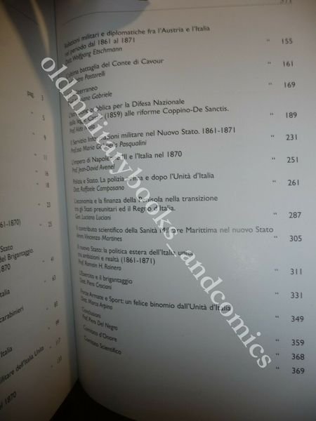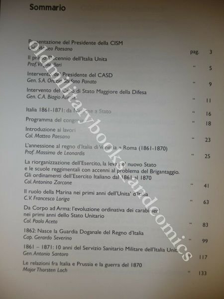 DESCRIZIONE: Ministero della Difesa Roma 2011, br. ed. ill., pp. 371 in 8° e alcune tavv. b/n f.t. L'anno 1861 sebbene abbia una importanza simbolica, quale momento topico del processo di unificazione della Nazione italiana, non rappresenta certo un punto di arrivo ma di nuovo inizio, di passaggio del nostro paese da compagine a realtà statuale. Questa è la ragione per la quale nella fase conclusiva dei festeggiamenti dei 150 anni della nascita dello Stato Italiano (17 marzo 1861) la Commissione Italiana di Storia Militare ha voluto organizzare un Convegno dal titolo "1861-1871: il Nuovo Stato". Un convegno storico- scientifico che ha esaminato proprio quel decennio che ha dato l'imprinting a tutto l'apparato nazionale, in tutti i suoi campi, con le connesse problematiche di riordino e costruzione: dall'economia alla finanza pubblica; dalle Istituzioni ai sistemi istituzionali; il nuovo Esercito, la Marina, i Carabinieri, la Guardia Doganale, le forze di polizia, il servizio informazioni militari, la sanità civile e militare e molti altri settori del sistema paese. Questa raccolta di atti riporta le approfondite relazioni sui principali nodi politici e militari emersi nel decennio 1861-1871, quali le riforme sociali (settore scolastico, legge Casati 1859 riconosciuta successivamente nelle leggi Coppino del 1877 e De Sanctis del1878), civili e militari, o ancora le attività poste in essere per la lotta al Brigantaggio e la sicurezza del Paese. CONDIZIONI: Ottime/Perfette. PESO / WEIGHT: 900 gr. without package