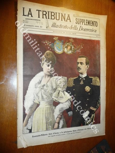 DESCRIZIONE: La Tribuna (Supplemento Illustrato della Domenica), Roma, Anno III n. 13 (31 Marzo 1895). COPERTINA: "Emanuele-Filiberto duca d'Aosta e la principessa Elena d'Orléans sua fidanzata" (ill. sconosciuto). RETRO: "La nuova divisa degli ufficiali italiani" (ill. sconosciuto). La Tribuna illustrata fu un settimanale italiano pubblicato a Roma. Fondato nel 1890 come supplemento del quotidiano La Tribuna, il primo numero uscì il 6 gennaio. Il formato della rivista era 27x38 cm e ogni numero conteneva 16 pagine. In breve tempo divenne il primo settimanale illustrato italiano. Nella prima metà del XX secolo, rivaleggia con il settimanale del Corriere della Sera, La Domenica del Corriere. CONDIZIONI: Buone, rivista proveniente da rilegatura, piccolo strappo alla cop. anteriore. PESO / WEIGHT: 35 gr. without package.