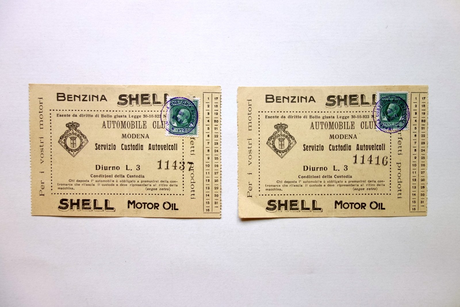 2 biglietti, Automobile Club Modena servizio custodia autoveicoli diurno L. 3 1923 circa S. d. ma 1923 circa; due biglietti a stampa su carta giallo chiaro; margini tratteggiati per distacco singolo; testo a entrambi i lati. Cm 8x11,5. Condizioni di conservazione Esemplari entrambi in buone condizioni con tracce d'uso, piega longitudinale. Per maggiori dettagli vedi foto. SC03.D17803 N