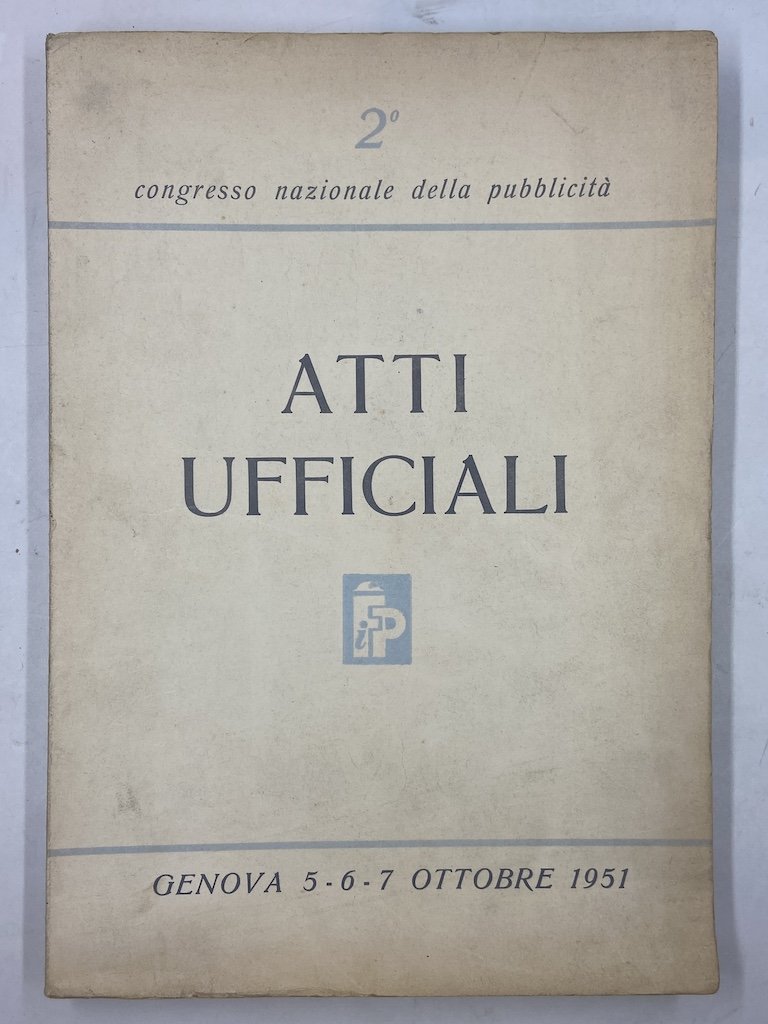 Brossura, cm 31x22, pp XLIV 360 (4), un paio di tavole in nero fuori testo. Atti del secondo Congresso Nazionale della Pubblicità indetto dalla Federazione Italiana della Pubblicità e dall’Unione Pubblicitari Associati. Contiene le relazioni presentate nel corso delle sedute, le mozioni presentate, l’elenco delle aziende partecipanti, e le assegnazioni di premi.