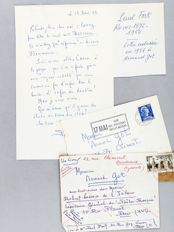 1 L.A.S. d'une page in-8, datée du 14 avril 1958 : "Entendu, bien cher ami : laissez pour titre le seul mot Berceuse. Et n'oubliez pas "référence" - because Flammarion. Suis encore alité. Cancer à la gorge que l'on refoule grâce aux "rayons cobalt" qui vous laisse un feu d'enfer dans la bouche. L'enfer du dentier ! Mais je veux vivre. Qui m'assure qu'il y aura des étoiles au-dessus des étoiles ? Sur terre il y a votre amitié !" - joint, contrecollé avec la première lettre sur 1 feuille découpée, 1 L.A.S. sur une petite carte, datée du 5 avril 1958 : "Vers Armand Got. S'il veut bien ébruiter. (je me cache derrière mes paupières). Affectueux souvenir de vieux trouvère". Nous joignons les deux enveloppes. 2 L.A.S. du poète Paul Fort, dont l'une extrêmement émouvante, dans laquelle il évoque la maladie qui le ronge et l'emportera deux ans plus tard.