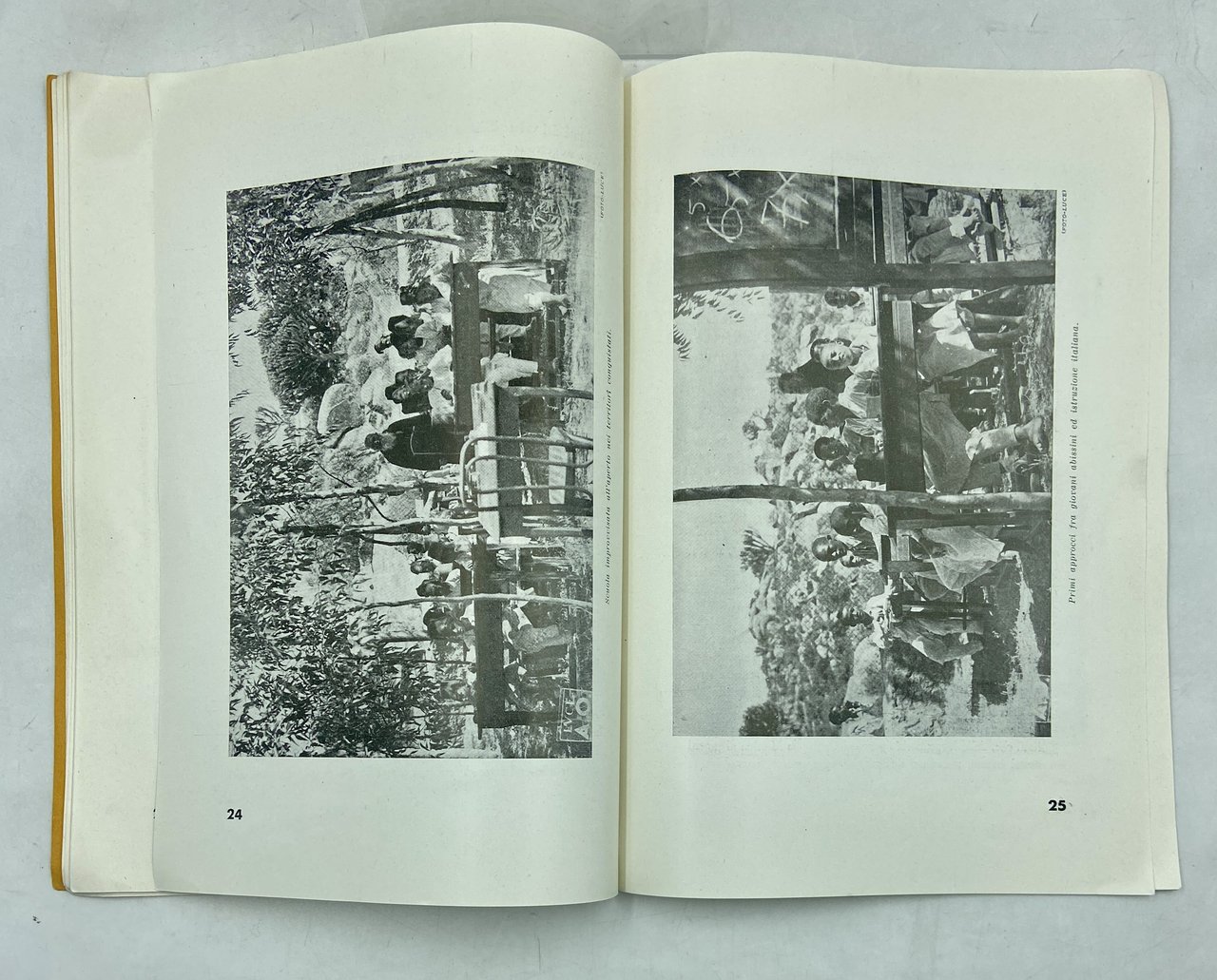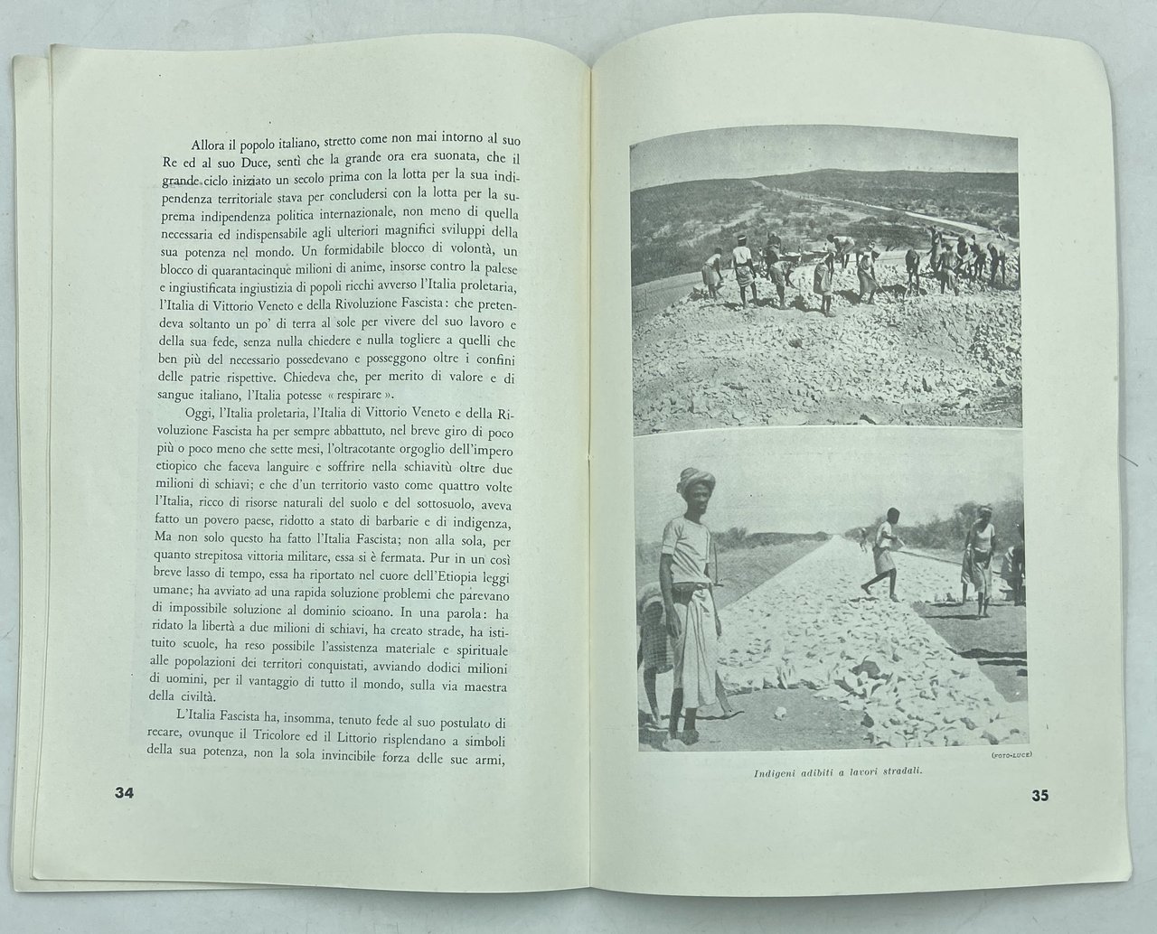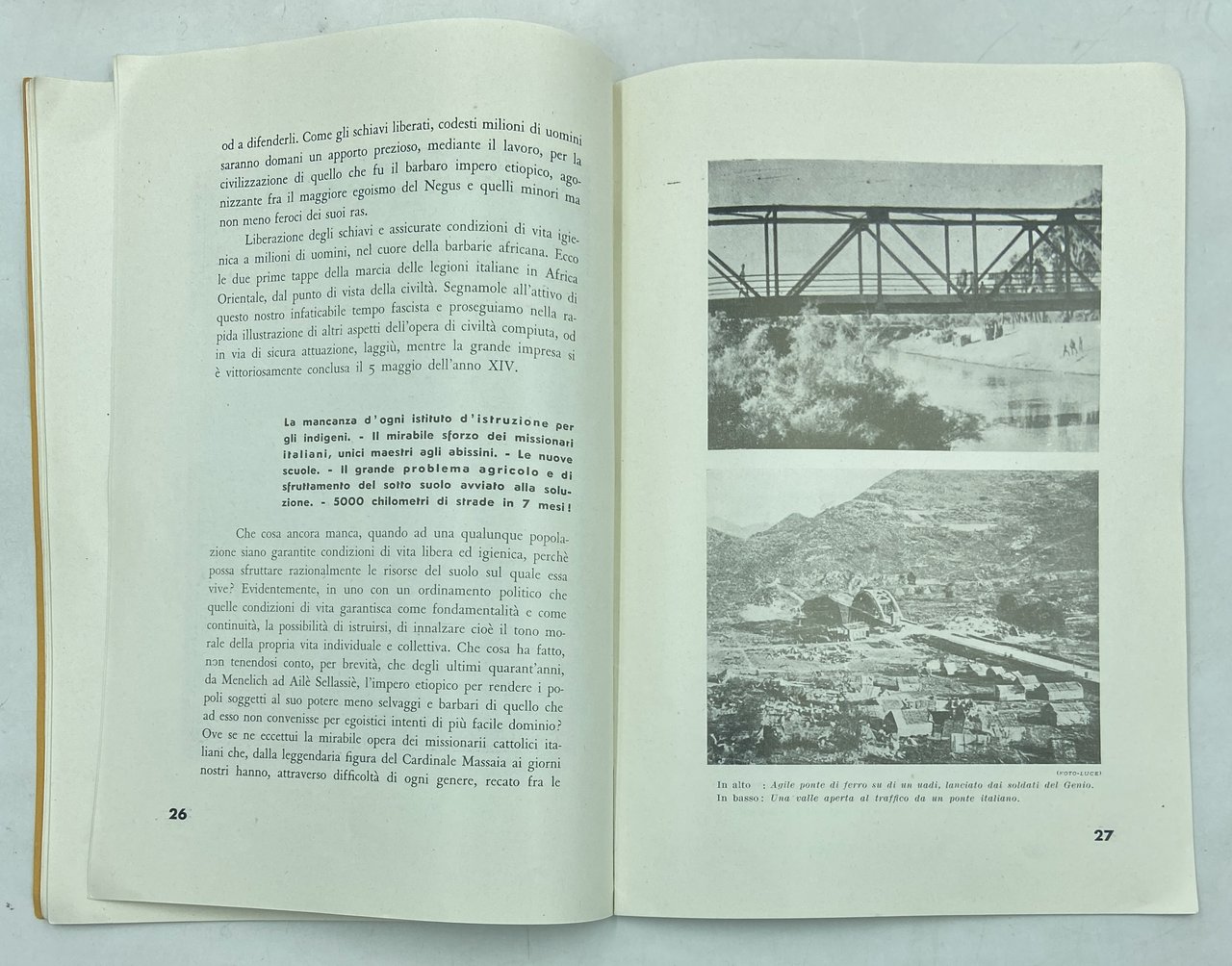 Brossura editoriale a stampa, cm 24.5 x 17, pp 39 (1), 23 fotografie in nero. Plaquette propagandistica che celebra la conquista coloniale fascista dell’Etiopia, rendendo conto dell’operato «civilizzatore» degli italiani nei primi sette mesi di occupazione. L'opuscolo insiste sull'abolizione della schiavitù, e presenta notizie e fotografie della costruzione di pozzi, ospedali, scuole e infrastrutture; in particolare i lavori per strade e ponti sono documentati con numerose immagini fotografiche dell’Istituto Luce.