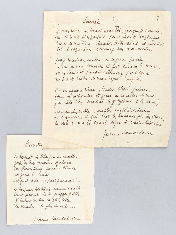 2 pièces autographes signées (circa 1938) : "Sonnet / Je veux faire un sonnet pour toi, puisque je t'aime / que rien n'est plus parfait que ce chant et plus pur / tant de vers t'ont chanté, trébuchants et mal sûrs / fols et capricieux comme je suis moi-même / " . [.] "Beautés perdues / Le bosquet de lilas jamais cueilis / pâles de leur excessive opulence / qui fleurissent pour le silence / et pour l'absence / - et quel dieu de quel paradis ? - / [ . ] Intéressantes pièces manuscrites signées de l'écrivain et poétesse Jeanne Sandelion (1899-1976).