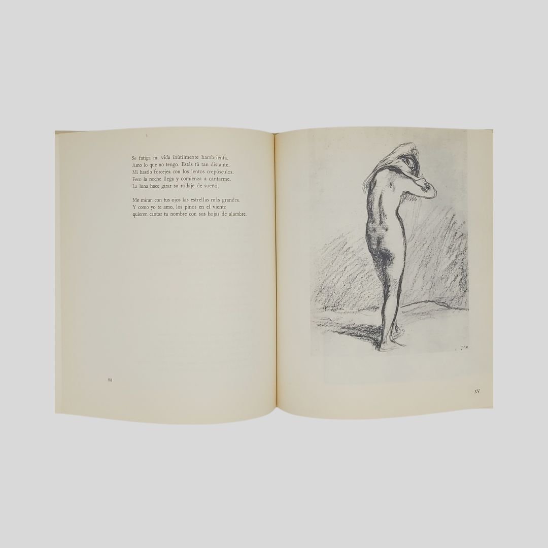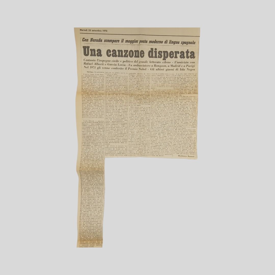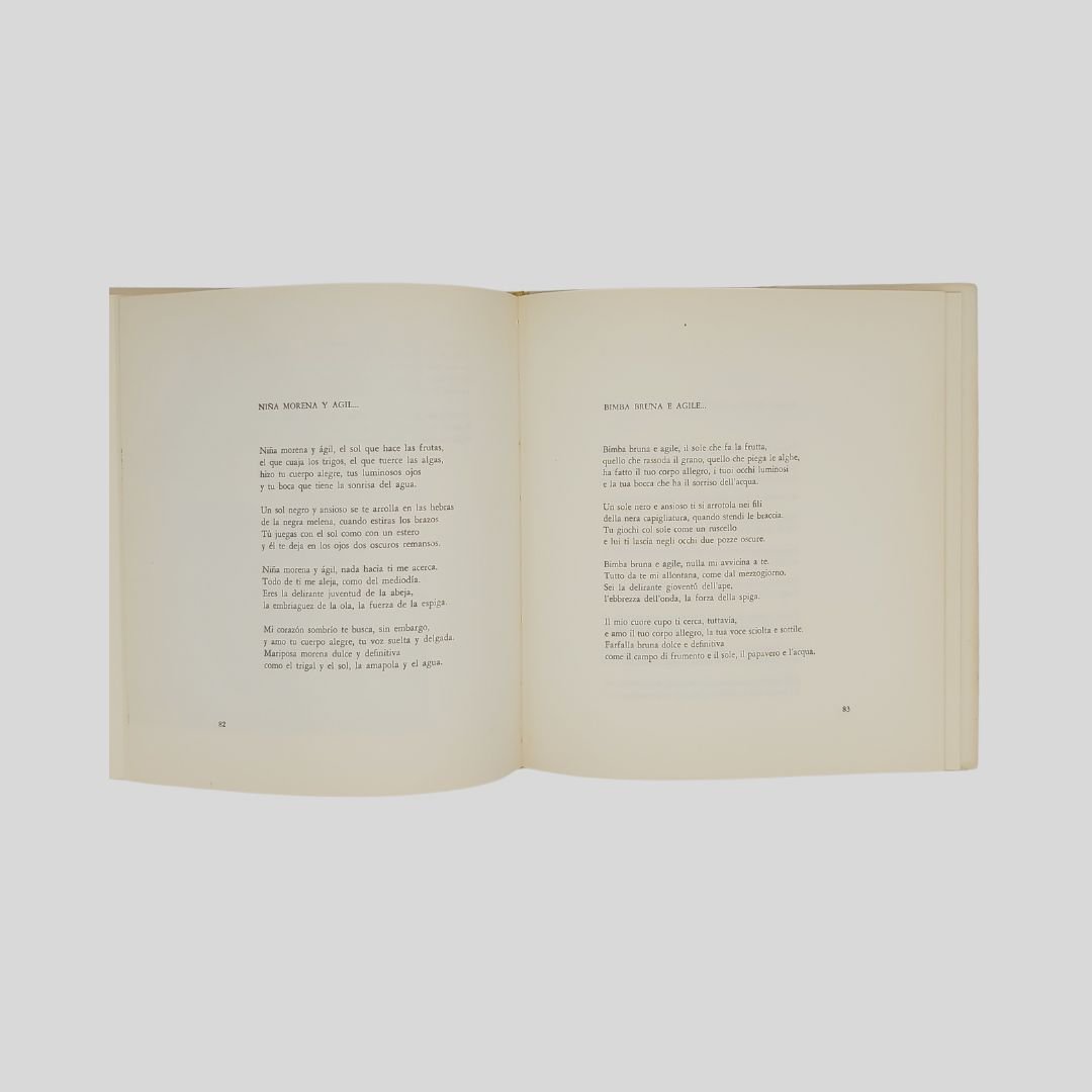 In-8° carrè (cm 20,8), pp. 107-[5]. Con 22 tavv. illustrate in b. n. f.t. Leg. edit. soprac. In ottime condizioni. Ristampa della seconda edizione. Testo spagnolo con traduzione italiana a fronte. In allegato articolo del 25 settembre 1973, in occasione della morte di Pablo Neruda, di Wolfango Rossani (all’anagrafe Sigfrido Rossi), inviato dal Cile.