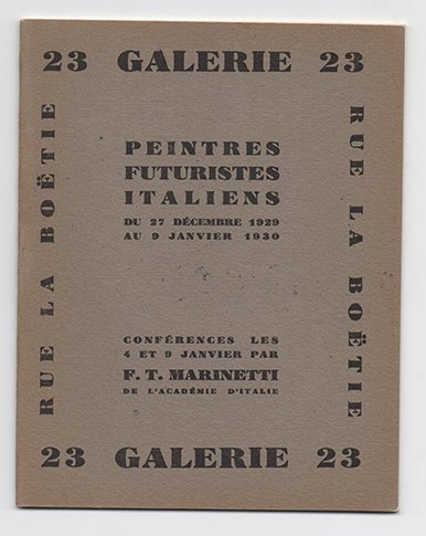 23 Galerie 23. Peintres futuristes italiens [.] Conférences [.] par F.T. Marinetti de l’Académie d’Italie [titolo in copertina; al frontespizio:] Severini. Russolo. Balla. Prampolini. Depero. Marasco. Dottori. Fillia. Pozzo. Ciacelli. Diulgheroff. Munari. Oriani. Sant’Elia. Sartoris