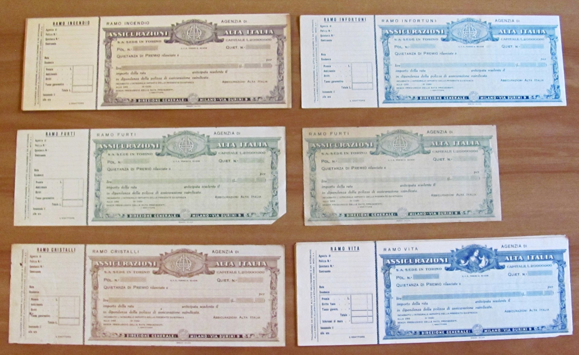 Quietanze assicurative Assicurazioni Alta Italia Sede in Torino. Varie quietanze così suddivise: 11 Ramo Incendio; 1 Ramo Cristalli; 1 Ramo Infortuni; 2 Ramo Furti (di cui una senza talloncino); 9 Ramo Vita. Rare e in Ottimo stato. , Ottimo (Fine)